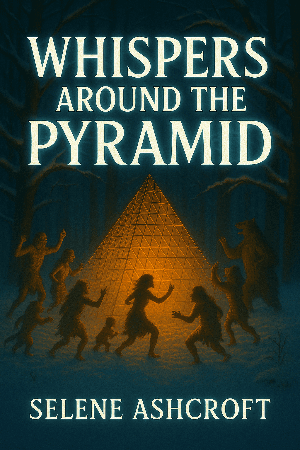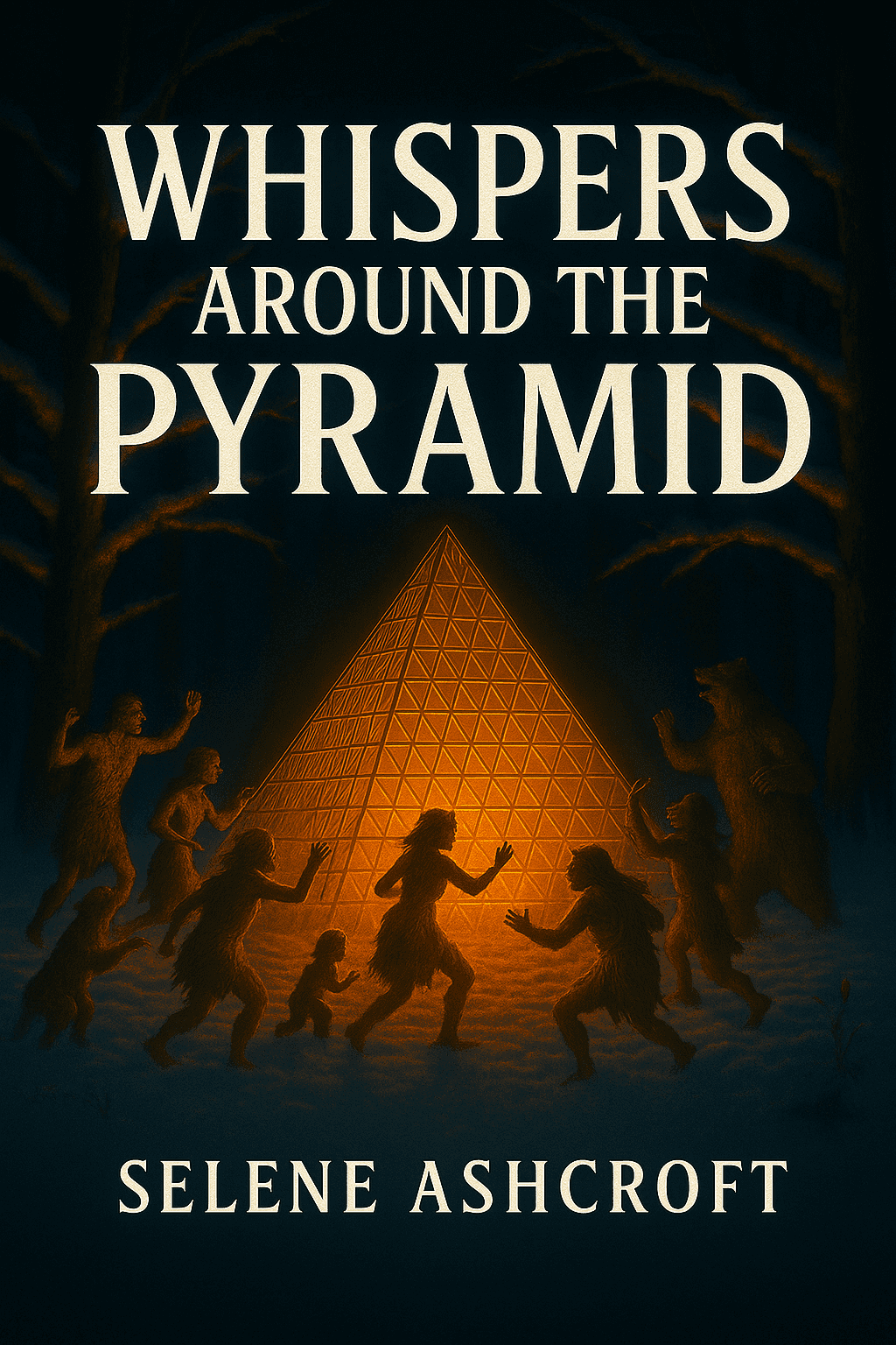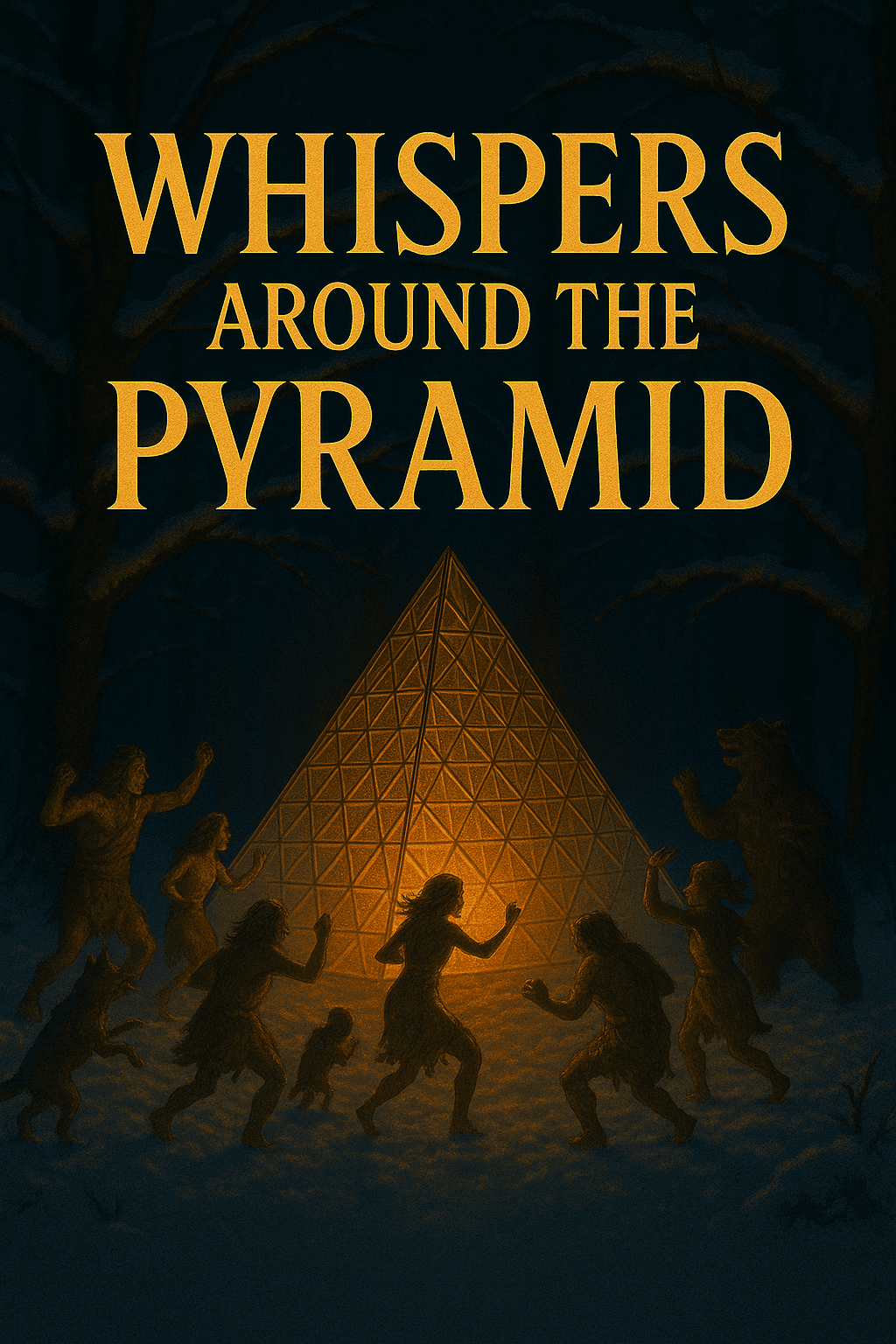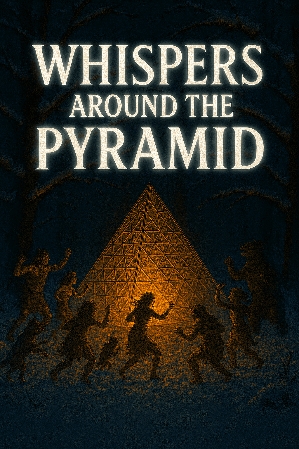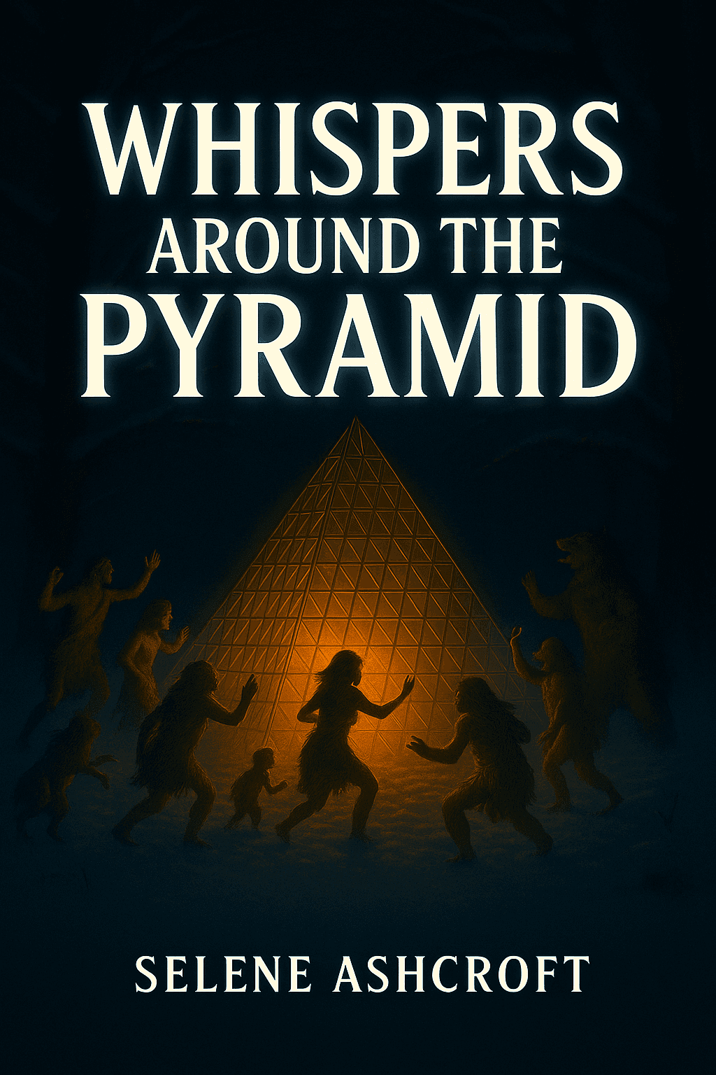Take the last generated image and place the text ‘Whispers Around the Pyramid’ as the book title. If the heading overlaps with the pyramid, position the text so it appears behind the pyramid, with light from the pyramid casting onto the text. The typography should be in UPPERCASE, bold, with edgy serif endings.