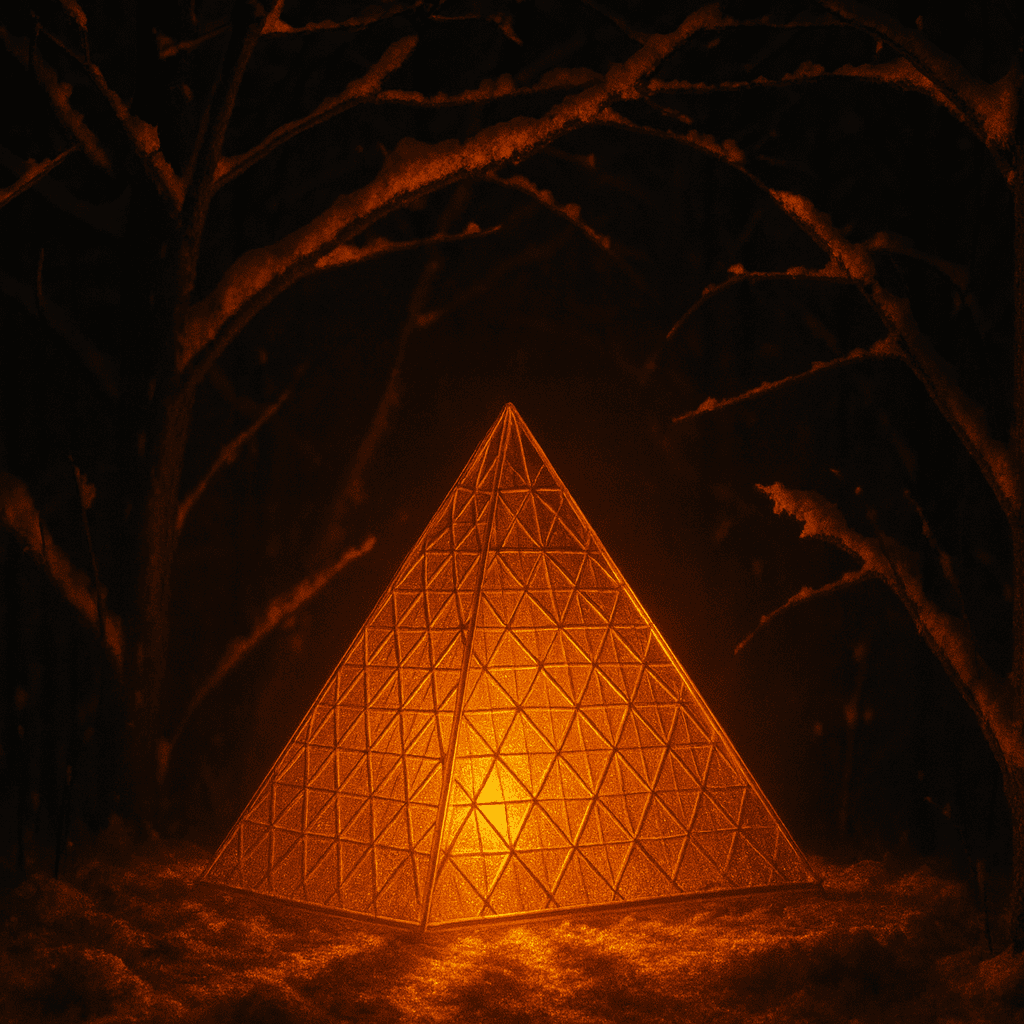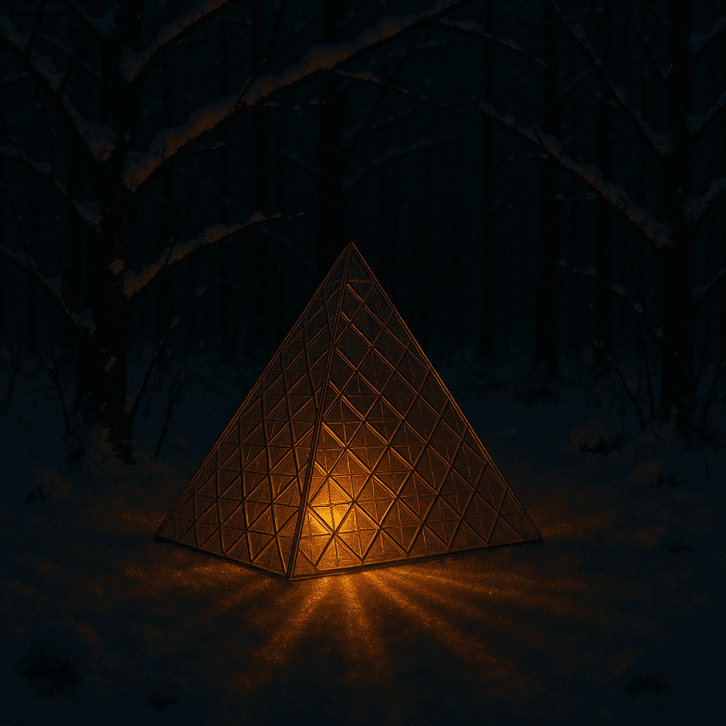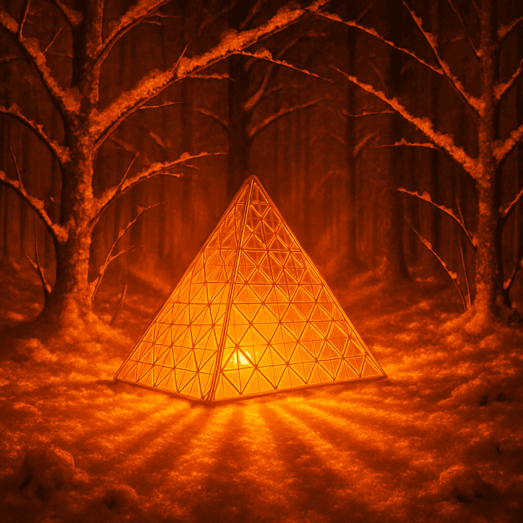 Generate an image of a glass prism with a glowing orange bulb placed behind it, casting reflections and illuminating the scene. The prism and bulb are set inside a green forest on a dark, snowy night. Snow covers the leafless tree branches, with a subtle orange glow reflecting on their surfaces. Ensure the composition follows principles of light and shadow.