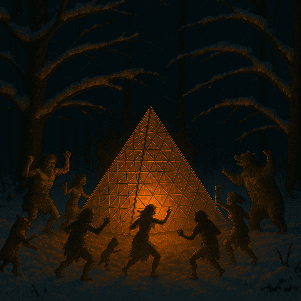 Around the image, place old human tribal people and wild animals dancing around the prism. Make sure to keep the size of triabl people and animal very small as compared to the pyramid.